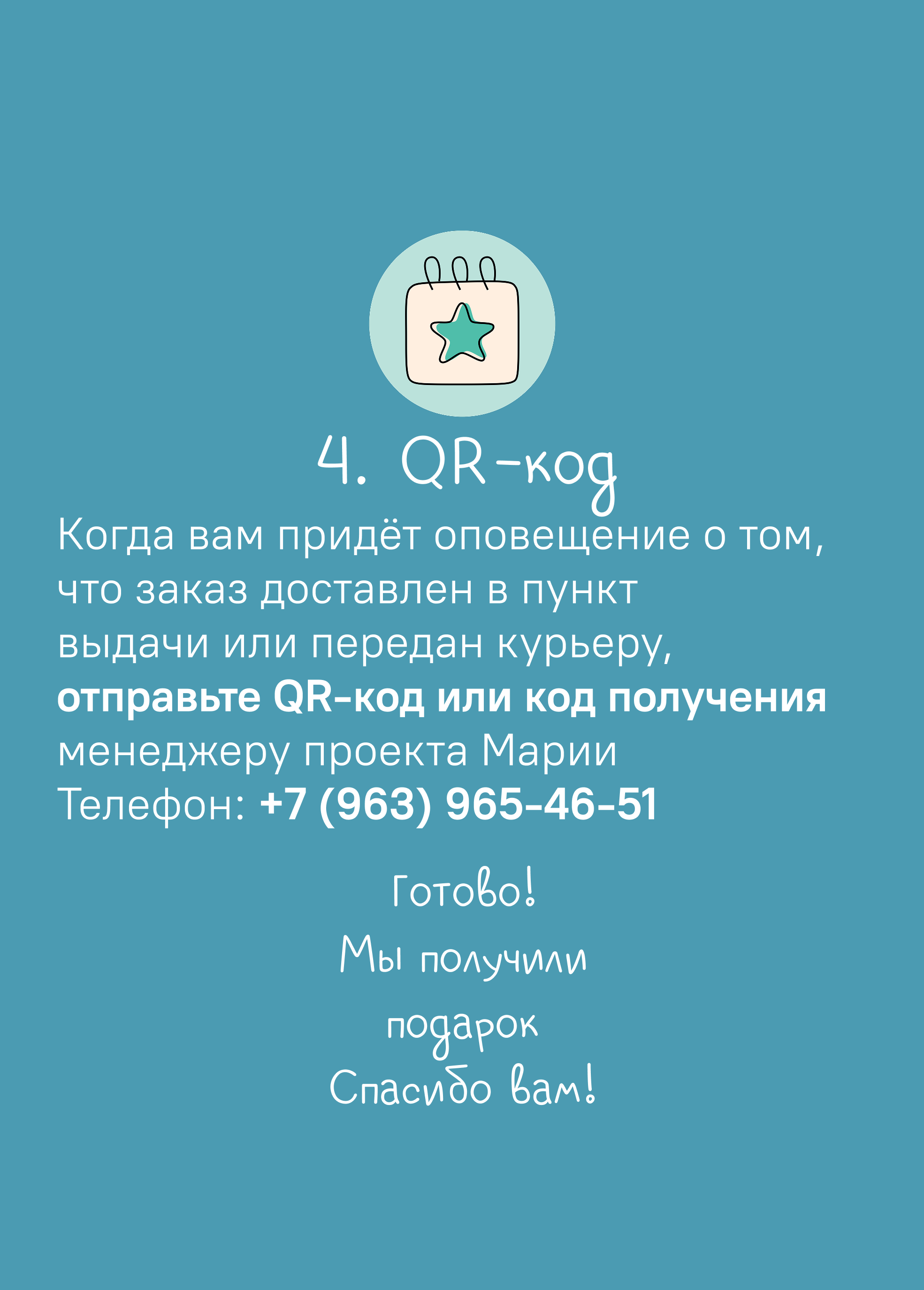 Когда вам придёт оповещение о том, что заказ доставлен в пункт выдачи, отправьте QR-код для получения менеджеру проекта